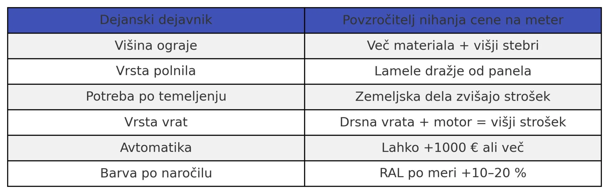 V letu 2025 se cene ograj gibljejo od 45 €/m za enostavne panelne ograje do tudi 200 €/m za prestižne lamelne sisteme z vrati in avtomatiko.